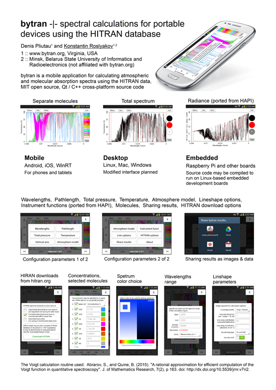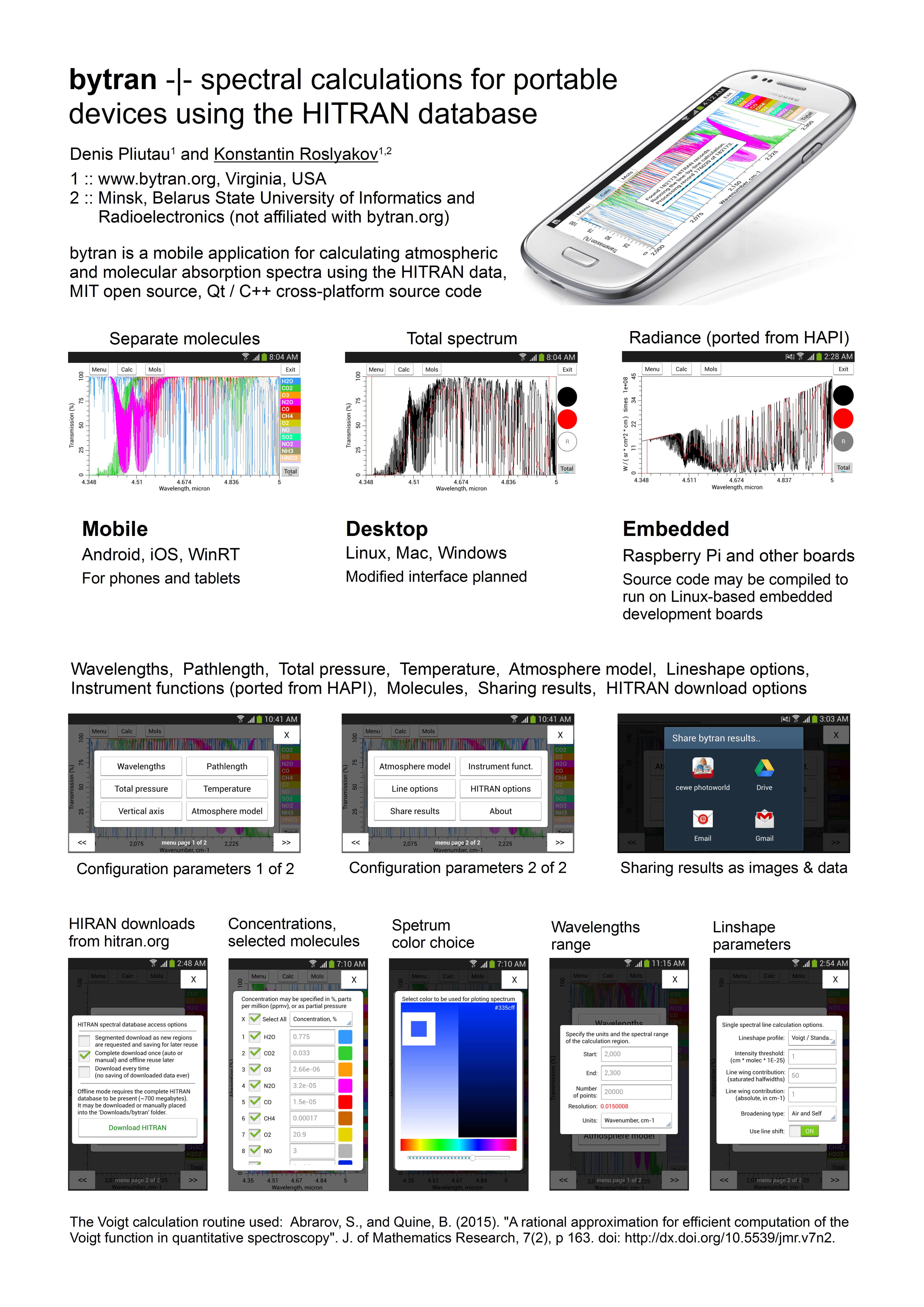 D. Pliutau, K. Roslyakov, "bytran -|- spectral calculations for portable devices using the HITRAN database", ASA-HITRAN 2016 Congress, University of Reims, France, August 24 - 26, 2016 (conference website,  book of abstracts,  abstract,  poster PNG,  poster PDF)
