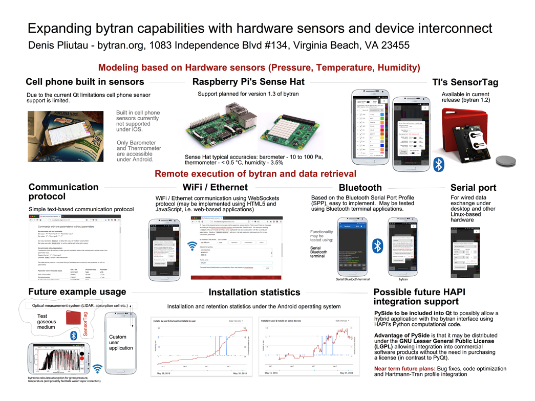 D. Pliutau, "Expanding bytran capabilities with hardware sensors and device interconnect", 15th HITRAN conference (united with the 14th ASA conference), Cambridge, Massachusetts, USA, June 13 - 15, 2018 (conference website,  book of abstracts,  abstract,  poster PNG,  poster PDF)